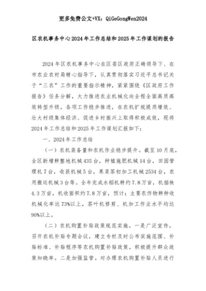 【七哥公文】2025年:区农机事务中心2024年工作总结和2025年工作谋划的报告+更多免费公文+VX:QiGeGongWen2024+更多免费公文+VX:QiGeGongWen2024