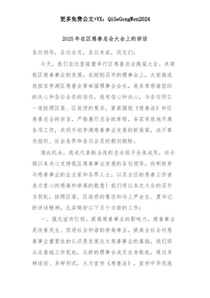 【七哥公文】2025年:2025年在区慈善总会大会上的讲话+更多免费公文+VX:QiGeGongWen2024+更多免费公文+VX:QiGeGongWen2024
