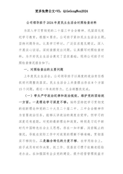 【七哥公文】2025年:公司领导班子2024年度民主生活会对照检查材料+更多免费公文+VX:QiGeGongWen2024+更多免费公文+VX:QiGeGongWen2024
