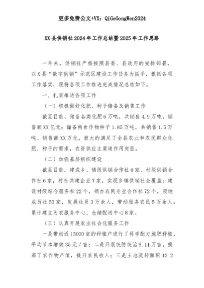 【七哥公文】2025年:XX县供销社2024年工作总结暨2025年工作思路+更多免费公文+VX:QiGeGongWen2024+更多免费公文+VX:QiGeGongWen2024