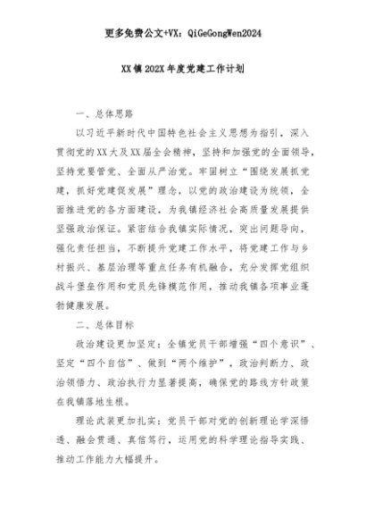 【七哥公文】2025年:XX镇202X年度党建工作计划+更多免费公文+VX:QiGeGongWen2024+更多免费公文+VX:QiGeGongWen2024