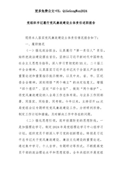 【七哥公文】2025年:党组织书记履行党风廉政建设主体责任述职报告+更多免费公文+VX:QiGeGongWen2024+更多免费公文+VX:QiGeGongWen2024