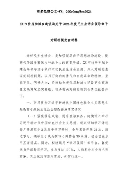 【七哥公文】2025年:XX市住房和城乡建设局关于2024年度民主生活会领导班子对照检视发言材料+更多免费公文+VX:QiGeGongWen2024+更多免费公文+VX:QiGeGongWen2024