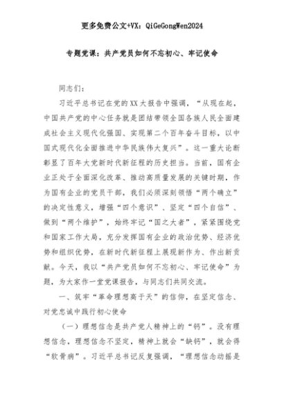 【七哥公文】2025年:专题党课:共产党员如何不忘初心、牢记使命+更多免费公文+VX:QiGeGongWen2024+更多免费公文+VX:QiGeGongWen2024