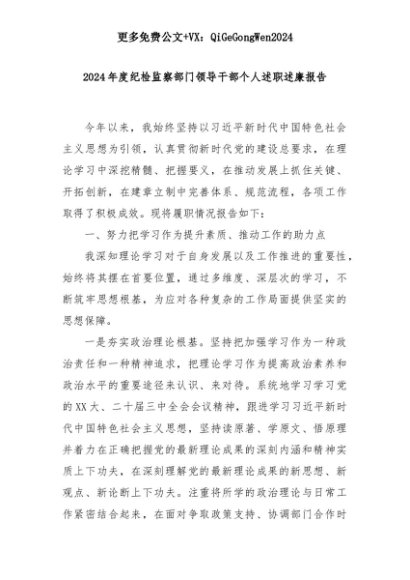 【七哥公文】2025年:2024年度纪检监察部门领导干部个人述职述廉报告+更多免费公文+VX:QiGeGongWen2024+更多免费公文+VX:QiGeGongWen2024