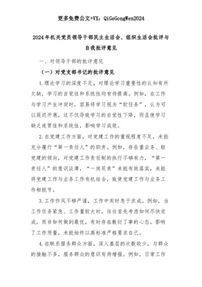 【七哥公文】2025年:2024年机关党员领导干部民主生活会、组织生活会批评与自我批评意见+更多免费公文+VX:QiGeGongWen2024+更多免费公文+VX:QiGeGongWen2024
