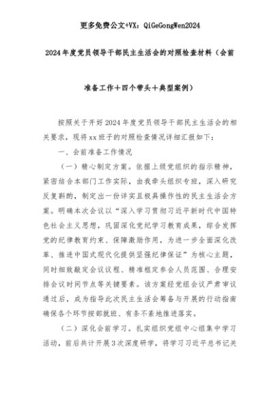 【七哥公文】2025年:2024年度党员领导干部民主生活会的对照检查材料(会前准备工作+四个带头+典型案例)+更多免费公文+VX:QiGeGongWen2024+更多免费公文+VX:QiGeGongWen2024