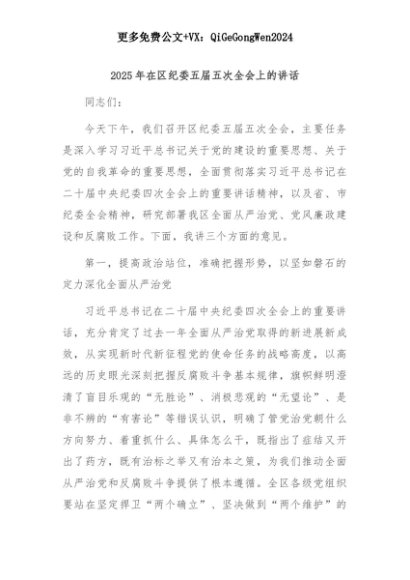 【七哥公文】2025年:2025年在区纪委五届五次全会上的讲话+更多免费公文+VX:QiGeGongWen2024+更多免费公文+VX:QiGeGongWen2024