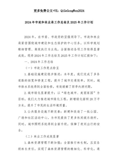 【七哥公文】2025年:2024年市政和林业局工作总结及2025年工作计划+更多免费公文+VX:QiGeGongWen2024+更多免费公文+VX:QiGeGongWen2024