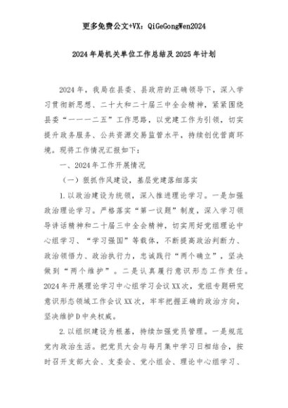 【七哥公文】2025年:2024年局机关单位工作总结及2025年计划+更多免费公文+VX:QiGeGongWen2024+更多免费公文+VX:QiGeGongWen2024