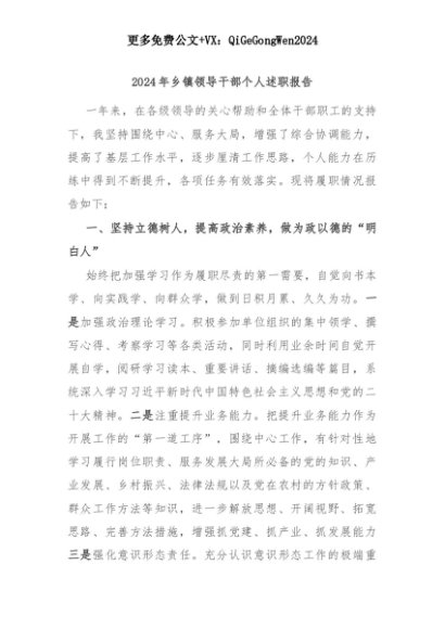 【七哥公文】2025年:2024年乡镇领导干部个人述职报告+更多免费公文+VX:QiGeGongWen2024+更多免费公文+VX:QiGeGongWen2024