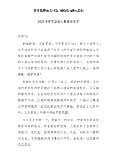 【七哥公文】2025年:2025年春节后收心教育会发言+更多免费公文+VX:QiGeGongWen2024+更多免费公文+VX:QiGeGongWen2024