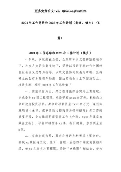 【七哥公文】2025年:(5篇)2024年工作总结和2025年工作计划(街道、镇乡)+更多免费公文+VX:QiGeGongWen2024+更多免费公文+VX:QiGeGongWen2024