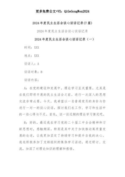 【七哥公文】2025年:(7篇)2024年度民主生活会谈心谈话记录+更多免费公文+VX:QiGeGongWen2024+更多免费公文+VX:QiGeGongWen2024