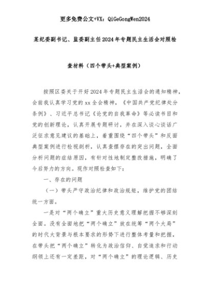 【七哥公文】2025年:某纪委副书记、监委副主任2024年专题民主生活会对照检查材料(四个带头+典型案例)+更多免费公文+VX:QiGeGongWen2024+更多免费公文+VX:QiGeGongWen2024