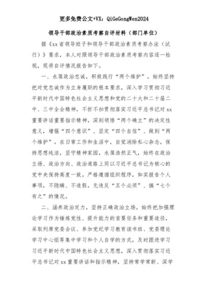 【七哥公文】2025年:领导干部政治素质考察自评材料(部门单位)+更多免费公文+VX:QiGeGongWen2024+更多免费公文+VX:QiGeGongWen2024
