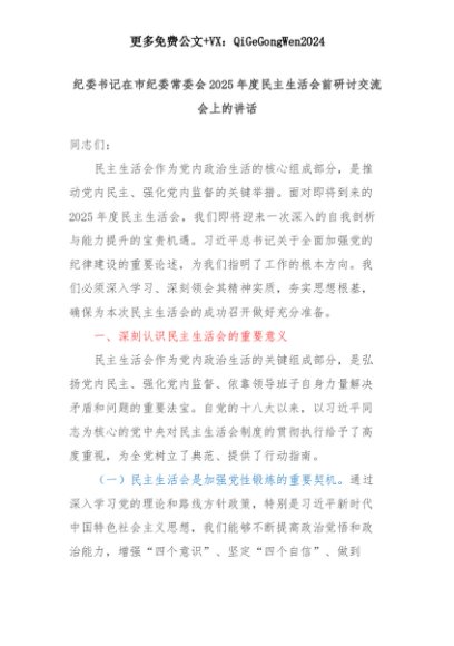 【七哥公文】2025年:纪委书记在市纪委常委会2025年度民主生活会前研讨交流会上的讲话+更多免费公文+VX:QiGeGongWen2024+更多免费公文+VX:QiGeGongWen2024