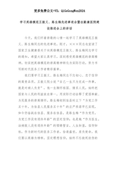【七哥公文】2025年:学习英雄模范王振义、路生梅先进事迹会暨在勤廉医院建设推进会上的讲话+更多免费公文+VX:QiGeGongWen2024+更多免费公文+VX:QiGeGongWen2024