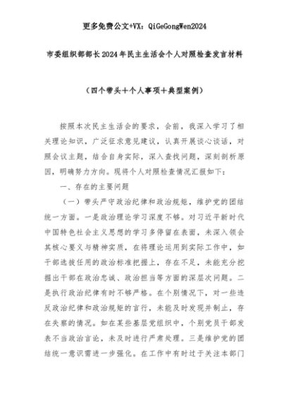 【七哥公文】2025年:市委组织部部长2024年民主生活会个人对照检查发言材料(四个带头+个人事项+典型案例)+更多免费公文+VX:QiGeGongWen2024+更多免费公文+VX:QiGeGongWen2024