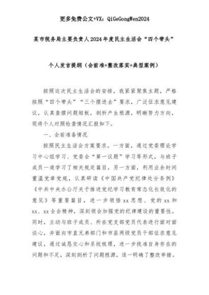 【七哥公文】2025年:某市税务局主要负责人2024年度民主生活会“四个带头”个人发言提纲(会前准+整改落实+典型案例)+更多免费公文+VX:QiGeGongWen2024+更多免费公文+VX:QiGeGongWen2024