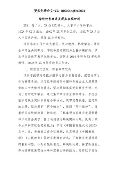 【七哥公文】2025年:学校校长事迹及现实表现材料+更多免费公文+VX:QiGeGongWen2024+更多免费公文+VX:QiGeGongWen2024