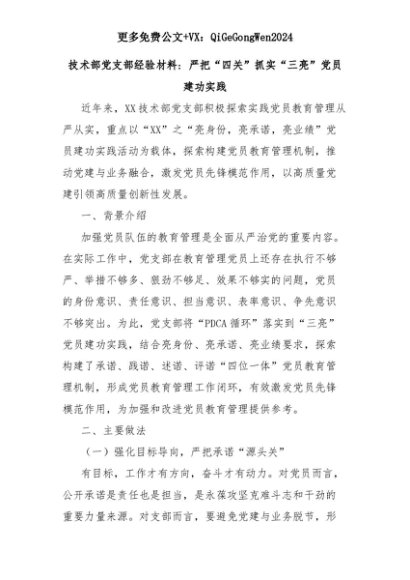 【七哥公文】2025年:技术部党支部经验材料:严把“四关”抓实“三亮”党员建功实践+更多免费公文+VX:QiGeGongWen2024+更多免费公文+VX:QiGeGongWen2024