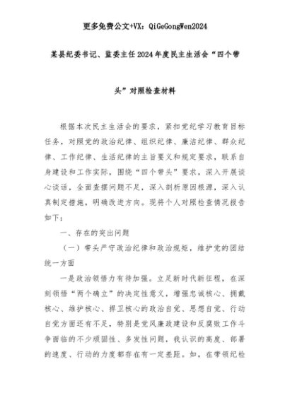 【七哥公文】2025年:某县纪委书记、监委主任2024年度民主生活会“四个带头”对照检查材料+更多免费公文+VX:QiGeGongWen2024+更多免费公文+VX:QiGeGongWen2024