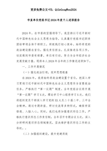 【七哥公文】2025年:市直单位党组书记2024年度个人述职报告+更多免费公文+VX:QiGeGongWen2024+更多免费公文+VX:QiGeGongWen2024