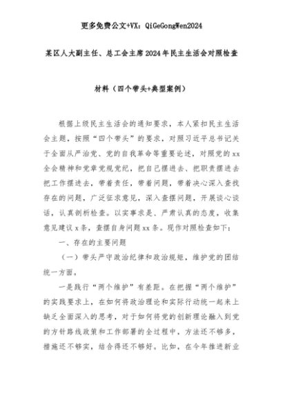 【七哥公文】2025年:某区人大副主任、总工会主席2024年民主生活会对照检查材料(四个带头+典型案例)+更多免费公文+VX:QiGeGongWen2024+更多免费公文+VX:QiGeGongWen2024
