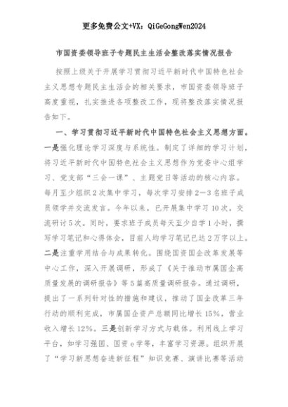 【七哥公文】2025年:市国资委领导班子专题民主生活会整改落实情况报告+更多免费公文+VX:QiGeGongWen2024+更多免费公文+VX:QiGeGongWen2024