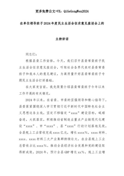 【七哥公文】2025年:在单位领导班子2024年度民主生活会征求意见座谈会上的主持讲话+更多免费公文+VX:QiGeGongWen2024+更多免费公文+VX:QiGeGongWen2024