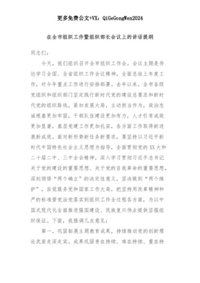 【七哥公文】2025年:在全市组织工作暨组织部长会议上的讲话提纲+更多免费公文+VX:QiGeGongWen2024+更多免费公文+VX:QiGeGongWen2024