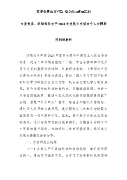 【七哥公文】2025年:市委常委、组织部长关于2024年度民主生活会个人对照检视剖析材料+更多免费公文+VX:QiGeGongWen2024+更多免费公文+VX:QiGeGongWen2024