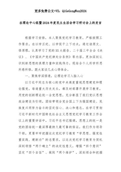 【七哥公文】2025年:在理论中心组暨2024年度民主生活会学习研讨会上的发言+更多免费公文+VX:QiGeGongWen2024+更多免费公文+VX:QiGeGongWen2024
