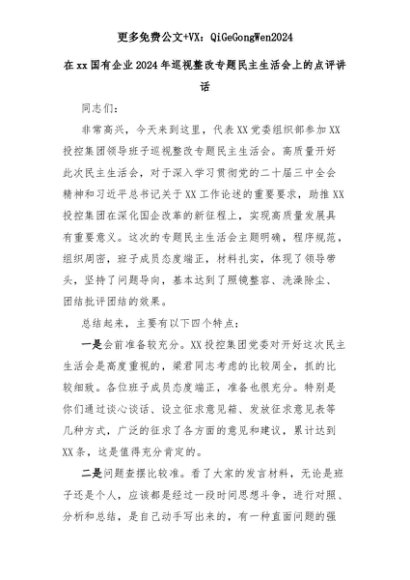 【七哥公文】2025年:在xx国有企业2024年巡视整改专题民主生活会上的点评讲话+更多免费公文+VX:QiGeGongWen2024+更多免费公文+VX:QiGeGongWen2024