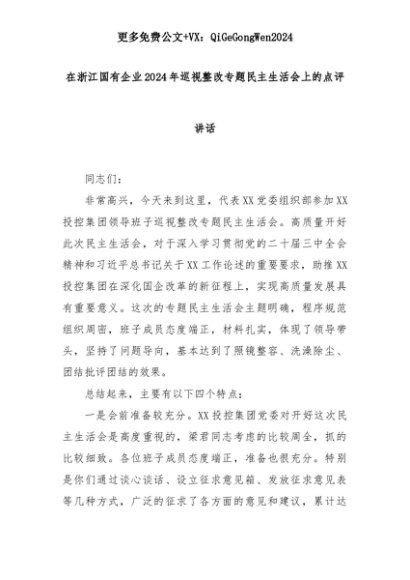 【七哥公文】2025年:在浙江国有企业2024年巡视整改专题民主生活会上的点评讲话+更多免费公文+VX:QiGeGongWen2024+更多免费公文+VX:QiGeGongWen2024