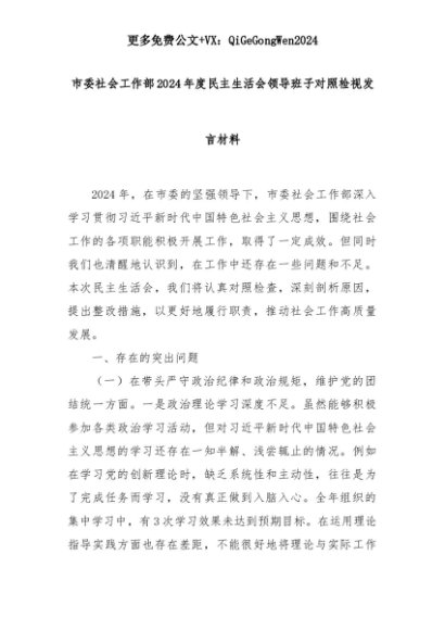 【七哥公文】2025年:市委社会工作部2024年度民主生活会领导班子对照检视发言材料+更多免费公文+VX:QiGeGongWen2024+更多免费公文+VX:QiGeGongWen2024
