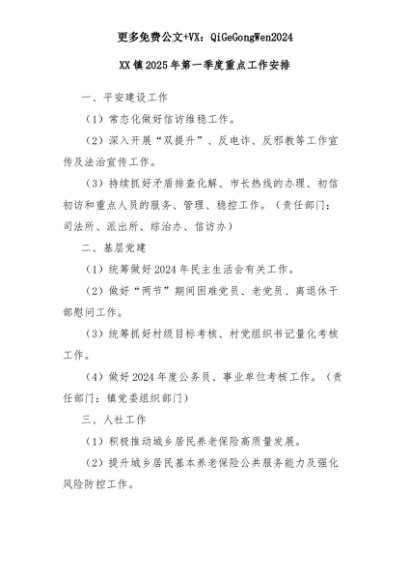 【七哥公文】2025年:XX镇2025年第一季度重点工作安排+更多免费公文+VX:QiGeGongWen2024+更多免费公文+VX:QiGeGongWen2024