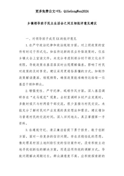 【七哥公文】2025年:乡镇领导班子民主生活会之间互相批评意见建议+更多免费公文+VX:QiGeGongWen2024+更多免费公文+VX:QiGeGongWen2024
