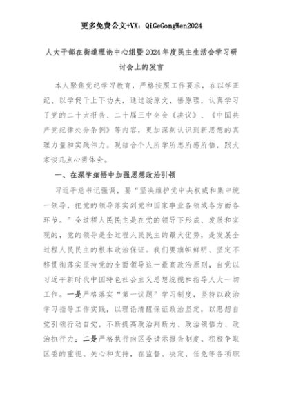 【七哥公文】2025年:人大干部在街道理论中心组暨2024年度民主生活会学习研讨会上的发言+更多免费公文+VX:QiGeGongWen2024+更多免费公文+VX:QiGeGongWen2024