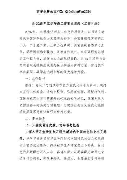 【七哥公文】2025年:县2025年意识形态工作要点思路(工作计划)+更多免费公文+VX:QiGeGongWen2024+更多免费公文+VX:QiGeGongWen2024