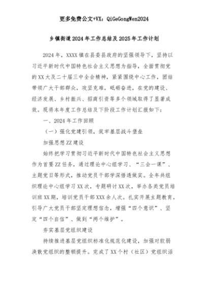【七哥公文】2025年:乡镇街道2024年工作总结及2025年工作计划+更多免费公文+VX:QiGeGongWen2024+更多免费公文+VX:QiGeGongWen2024