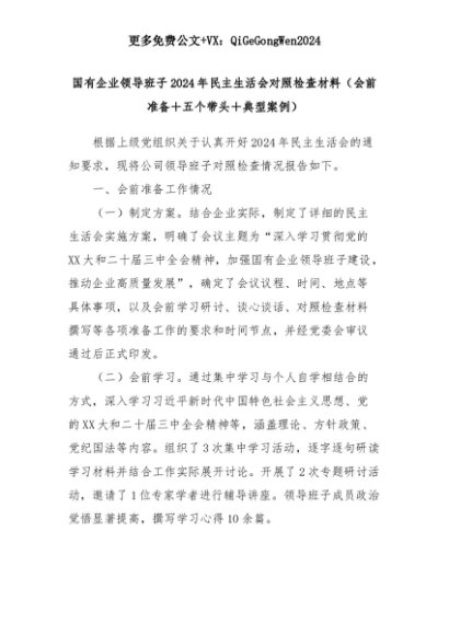 【七哥公文】2025年:国有企业领导班子2024年民主生活会对照检查材料(会前准备+五个带头+典型案例)+更多免费公文+VX:QiGeGongWen2024+更多免费公文+VX:QiGeGongWen2024