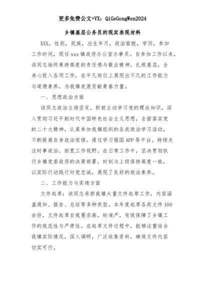 【七哥公文】2025年:乡镇基层公务员的现实表现材料+更多免费公文+VX:QiGeGongWen2024+更多免费公文+VX:QiGeGongWen2024