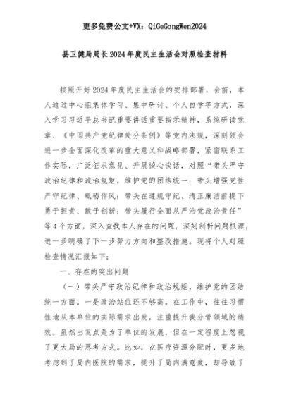 【七哥公文】2025年:县卫健局局长2024年度民主生活会对照检查材料+更多免费公文+VX:QiGeGongWen2024+更多免费公文+VX:QiGeGongWen2024
