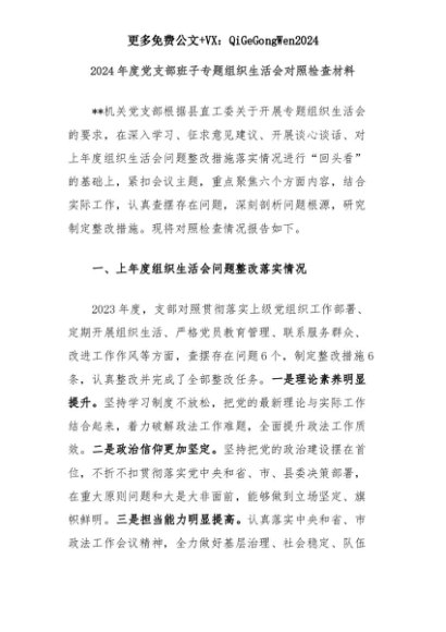 【七哥公文】2025年:2024年度党支部班子专题组织生活会对照检查材料+更多免费公文+VX:QiGeGongWen2024+更多免费公文+VX:QiGeGongWen2024