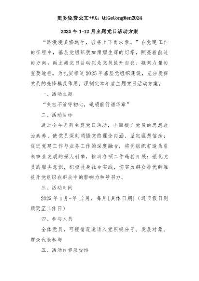 【七哥公文】2025年:2025年1-12月主题党日活动方案+更多免费公文+VX:QiGeGongWen2024+更多免费公文+VX:QiGeGongWen2024