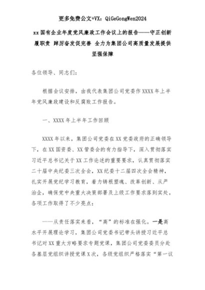 【七哥公文】2025年:xx国有企业年度党风廉政工作会议上的报告——守正创新履职责 踔厉奋发促完善 全力为集团公司高质量发展提供坚强保障+更多免费公文+VX:QiGeGongWen2024+更多免费公文+VX:QiGeGongWen2024