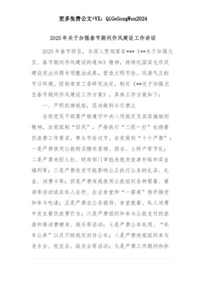 【七哥公文】2025年:2025年关于加强春节期间作风建设工作讲话+更多免费公文+VX:QiGeGongWen2024+更多免费公文+VX:QiGeGongWen2024