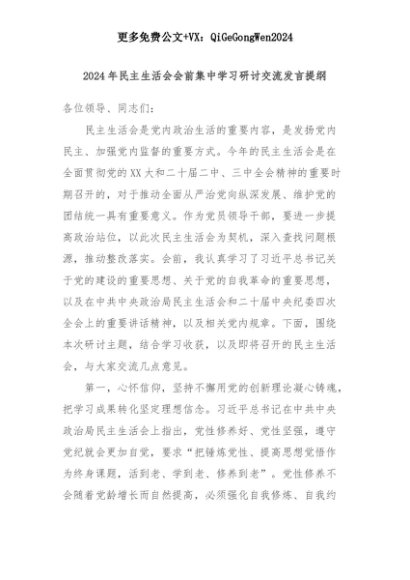 【七哥公文】2025年:2024年民主生活会会前集中学习研讨交流发言提纲+更多免费公文+VX:QiGeGongWen2024+更多免费公文+VX:QiGeGongWen2024